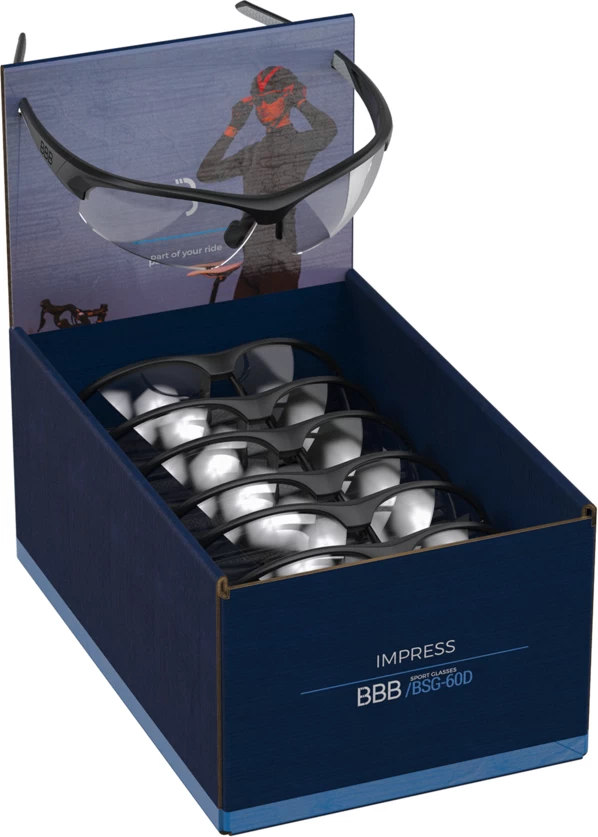 De BSG-60 Impress Fietsbril van BBB is een moderne sportbril met een lichtgewicht frame. De lensvorm biedt volledige bescherming tegen zonlicht, stof en wind. Met een hoogwaardig Hi-impact polycarbonaat frame is de bril zeer stevig.