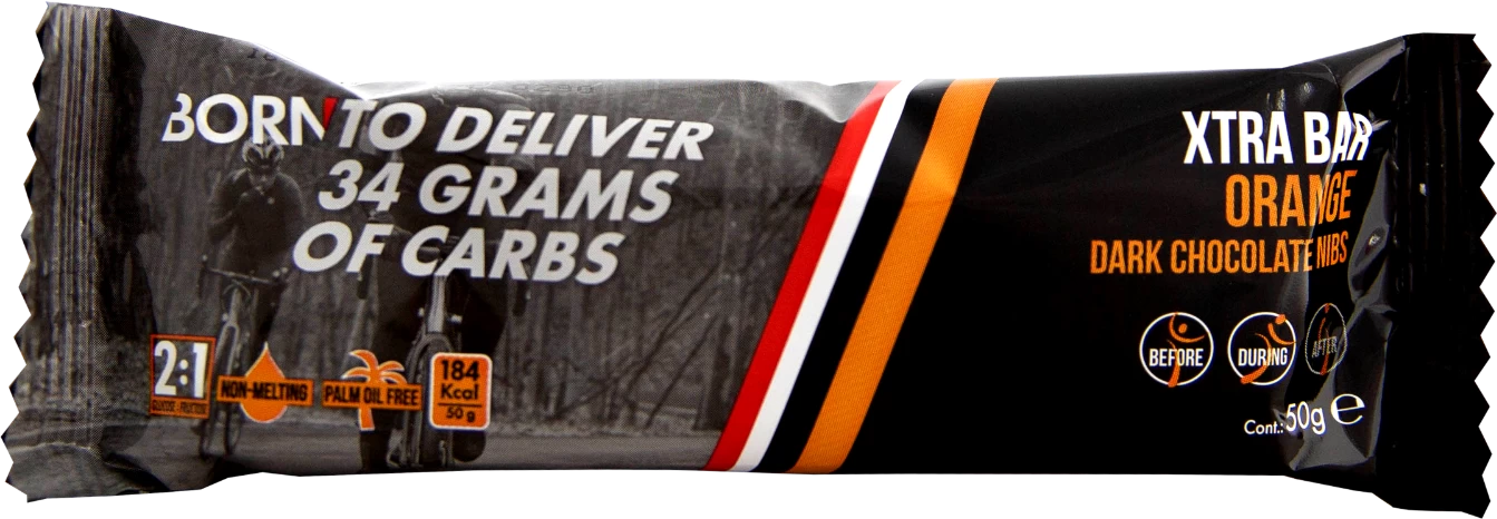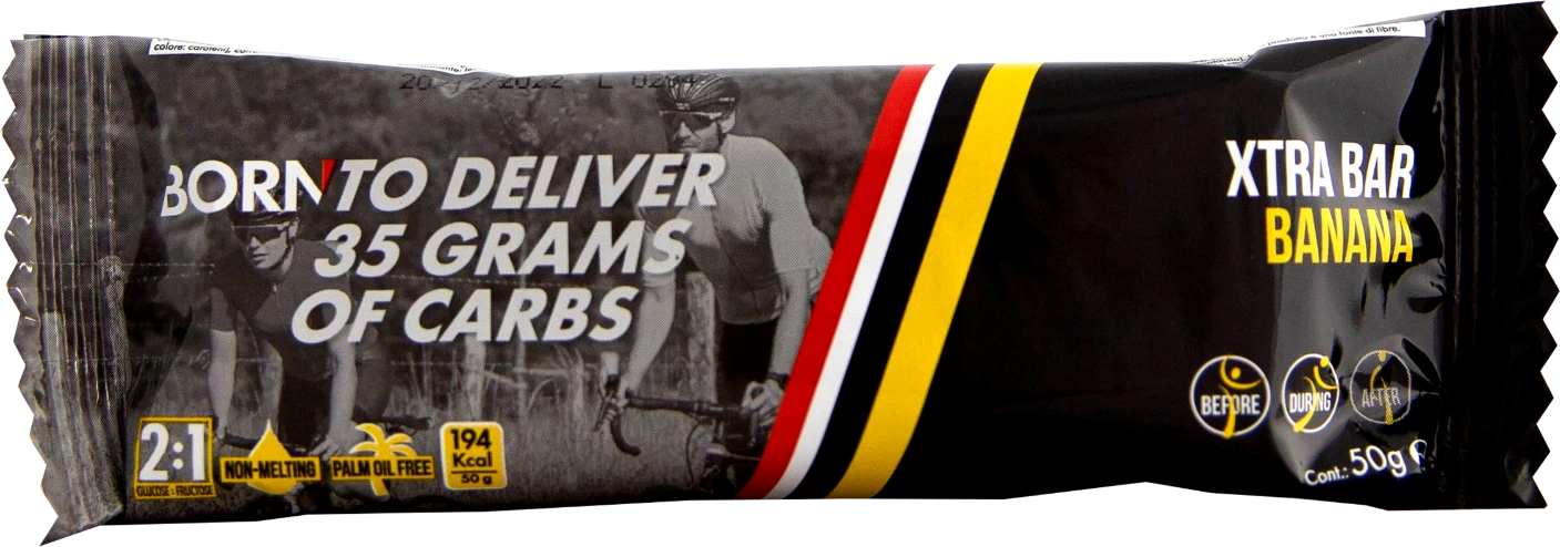 Xtra energie met deze energiereep van Born. De Xtra energierepen zorgen voor een langere aanvoer van energie ten opzichte van de normale Born repen. Deze langdurige afgifte komt voor uit een combinatie van verschillende type koolhydraten. Born Xtra Bar banana heeft een heerlijke vulling van rijstcrisps, havervlokken, stukjes aardbei en banaan, omhuld met een yoghurtcoating. De Orange smaak heeft daarentegen sinaasappelstukjes en pure chocoladesnippers. Per reep levert dit ongeveer 34-39 gram koolhydraten op. De Xtra Bar is gemakkelijk weg te happen, dus ook prima te gebruiken tijdens wedstrijden of in lastige omstandigheden.